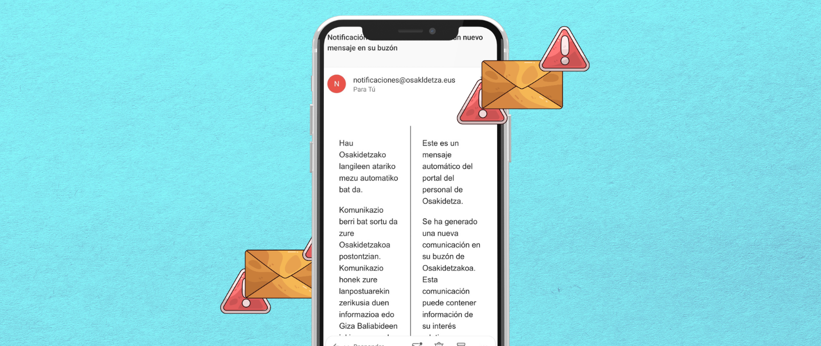 «El Osakidetza, el servicio vasco de salud, está enviando correos electrónicos indicando que tienes una notificación pendiente y que necesitas acceder mediante tu usuario y contraseña»