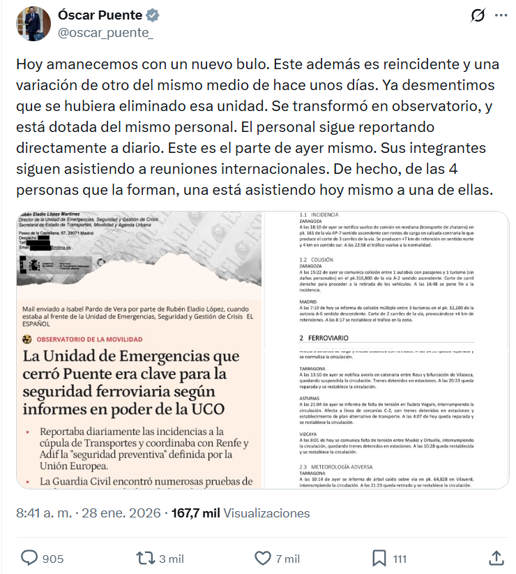 Los contenidos que han circulado a raíz del accidente ferroviario de Adamuz afirman que la Unidad de Emergencias “no actuaba sólo cuando ocurría un accidente, su principal valor estaba en el trabajo previo”, mientras que el actual observatorio “no ha tenido ningún papel en la prevención de accidentes”. El ministro Óscar Puente los ha calificado de “bulo” y ha afirmado que las mismas cuatro personas que formaban la unidad, que hoy forman parte del observatorio, “no tienen ninguna competencia en materia de prevención y seguridad ferroviaria”.