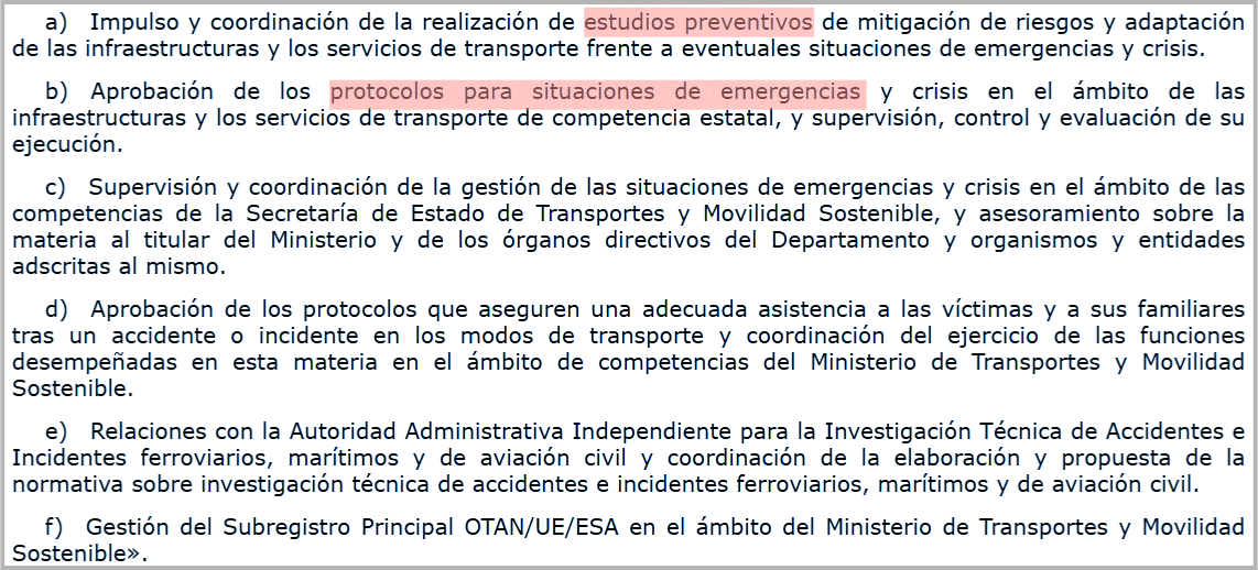 El Ministerio de Transportes modificó su estructura en julio de 2025 y “suprimió”, en palabras textuales del BOE, la Unidad de Emergencias, Seguridad y Gestión de Crisis. Este organismo se sustituyó por un observatorio, del que no hay información pública sobre sus reuniones, funciones o composición a fecha de publicación de este artículo.