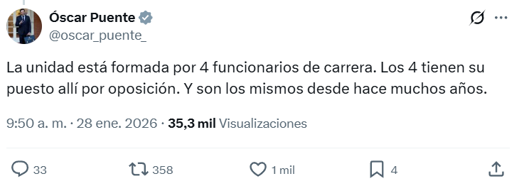 Según Óscar Puente en su comparecencia del Senado, los integrantes del Observatorio son “un historiador, un psicólogo y dos auxiliares administrativos”. Pero los datos públicos fechados a 8 de enero de 2026 indican que hay un administrativo, no dos; y que el resto del personal serían tres, no dos.