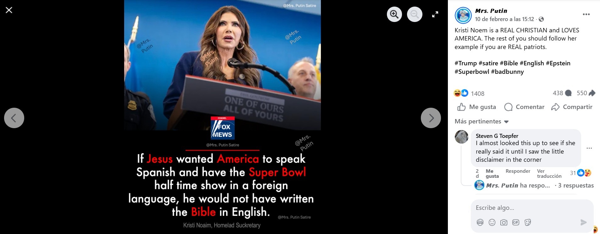 Kristi Noem, la secretaria de Seguridad Nacional de Estados Unidos, no ha dicho que “si Jesús hubiera querido que Estados Unidos hablara español, no habría escrito la biblia en inglés” refiriéndose supuestamente a la actuación en español que hizo Bad Bunny en el medio tiempo de la Super Bowl. La afirmación proviene de la página de Facebook “Mrs. Putin” que se autodenomina como “sátira/parodia” y fue publicada el 10 de febrero de 2026 con el hashtag “#satire”.