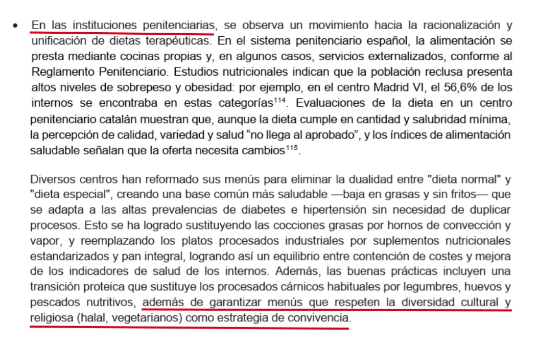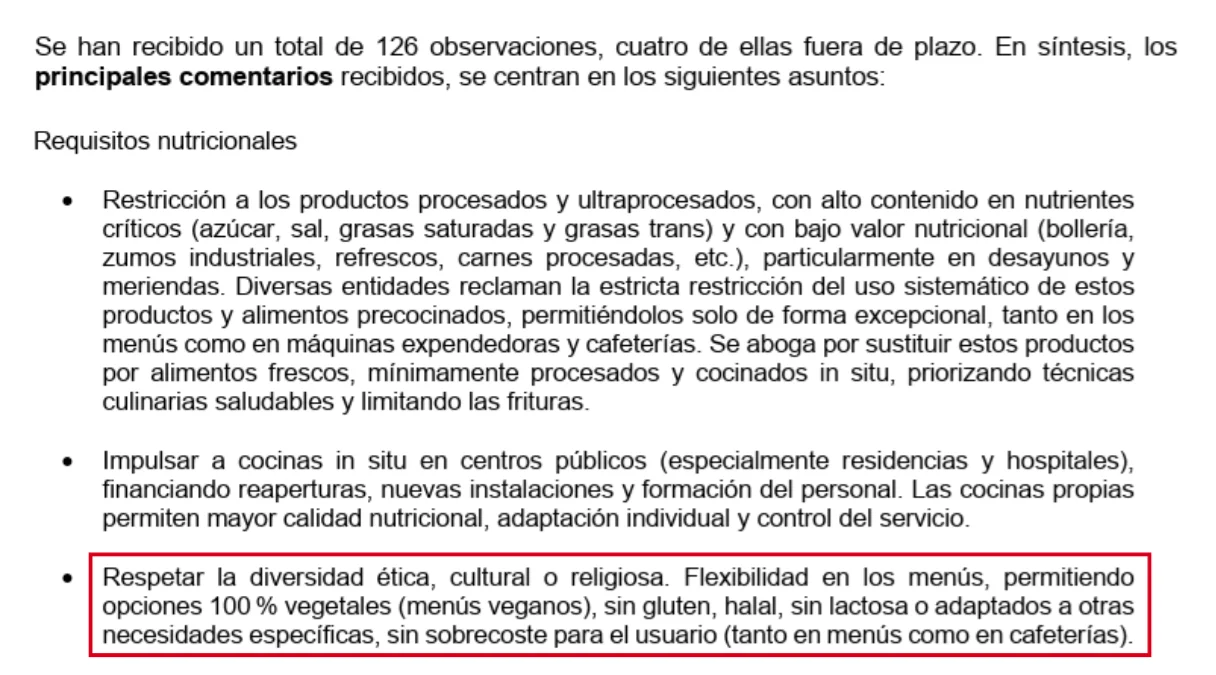La mención a este tipo de menús sí aparece dentro de los comentarios que se hicieron al borrador del real decreto sobre alimentación saludable en centros sanitarios y sociosanitarios cuando este se sometió a consulta pública entre el 22 de mayo y el 21 de junio de 2025. En las aportaciones sobre requisitos nutricionales, se indicó “respetar la diversidad ética, cultural o religiosa. Flexibilidad en los menús, permitiendo opciones 100% vegetales (menús veganos), sin gluten, halal, sin lactosa o adaptados a otras necesidades específicas”. También se incluye la referencia a los menús ‘halal’ en un ejemplo de buenas prácticas en instituciones penitenciarias, en las que se ha incluido este tipo de alimentación, entre otras, como “estrategia de convivencia”.