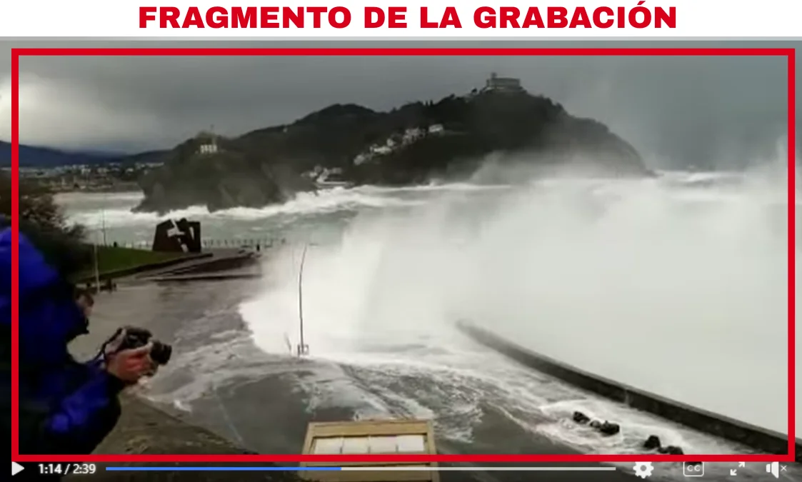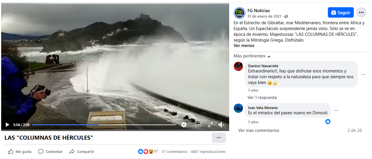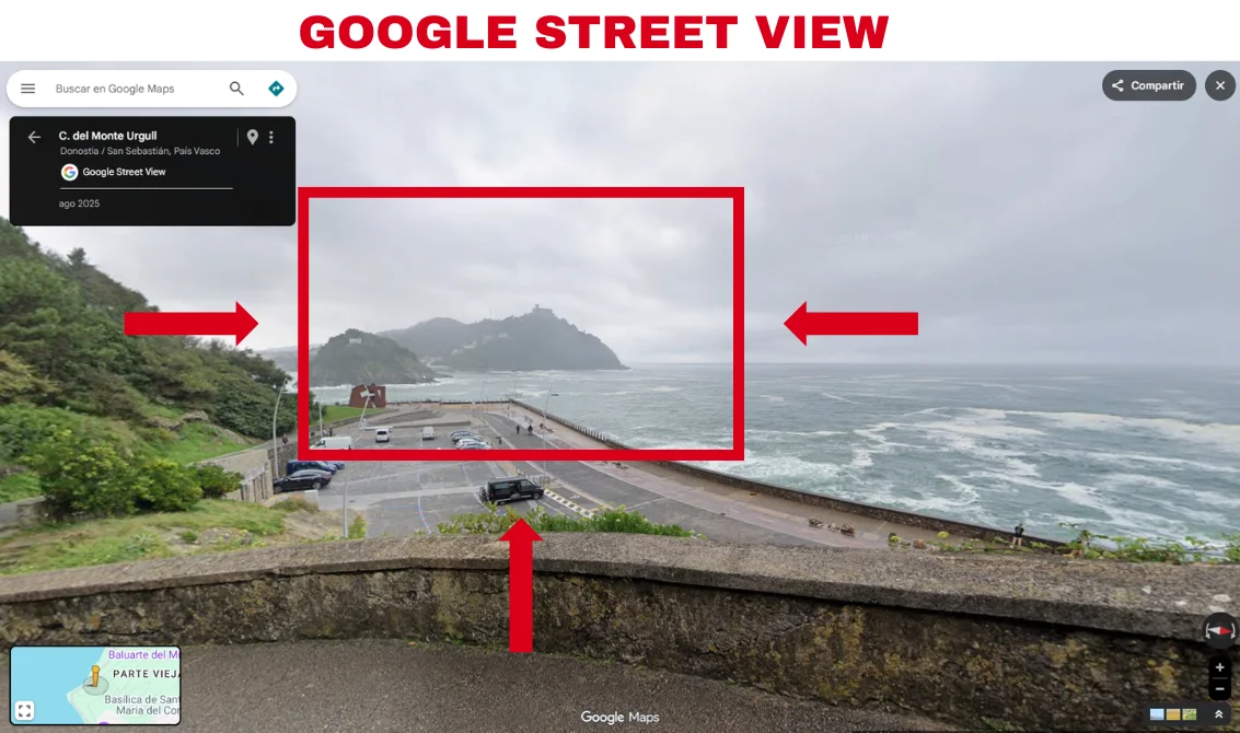 Captura de pantalla de la Calle del Monte Urgull en San Sebastián con Google Street View. Captura de pantalla de la grabación que se mueve junto a mensajes que aseguran que se trata supuestamente del Estrecho de Gibraltar.Captura de pantalla de la grabación que se mueve junto a mensajes que aseguran que se trata supuestamente del Estrecho de Gibraltar.