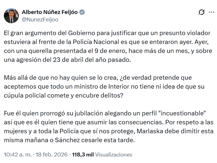 El líder del PP, Alberto Núñez Feijóo, escribió el 18 de febrero en Twitter (ahora X): “El gran argumento del Gobierno para justificar que un presunto violador estuviera al frente de la Policía Nacional es que se enteraron ayer. Ayer, con una querella presentada el 9 de enero, hace más de un mes, y sobre una agresión del 23 de abril del año pasado”.