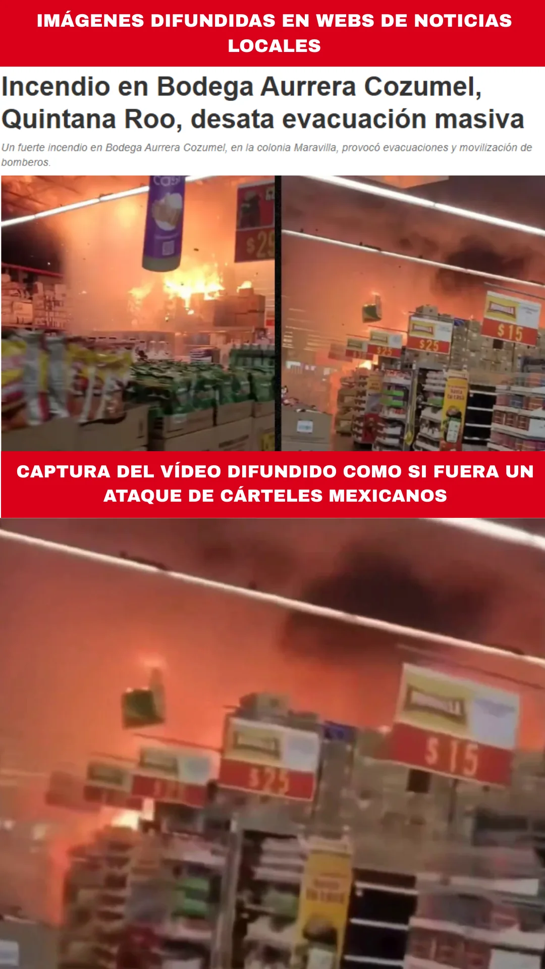 Según las primeras hipótesis de las autoridades locales, el incendio que se muestra en el vídeo difundido se produjo por un cortocircuito y no tendría relación con los disturbios ocasionados en México tras la muerte de ‘El Mencho’, líder del Cártel Jalisco Nueva Generación, como afirman los contenidos difundidos. Las imágenes se grabaron el 22 de febrero de 2026 en una tienda de la cadena mexicana de supermercados Bodega Aurrera en Cozumel (Quintana Roo, México). Diversas webs locales se hicieron eco del suceso y las imágenes que acompañan al texto coinciden con las del vídeo.