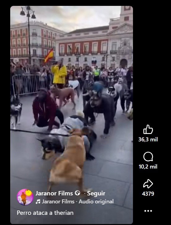 Este vídeo que muestra a un perro atacando a un therian en la Puerta del Sol de Madrid no es real. Fue publicado por la cuenta “Jaranor Films” que se identifica como “creador de contenido digital, imágenes aéreas de Drone, creación y producción de contenido audiovisual, inspiración creativa en imágenes IA” y tiene publicados en su cuenta de Facebook contenidos generados con inteligencia artificial.