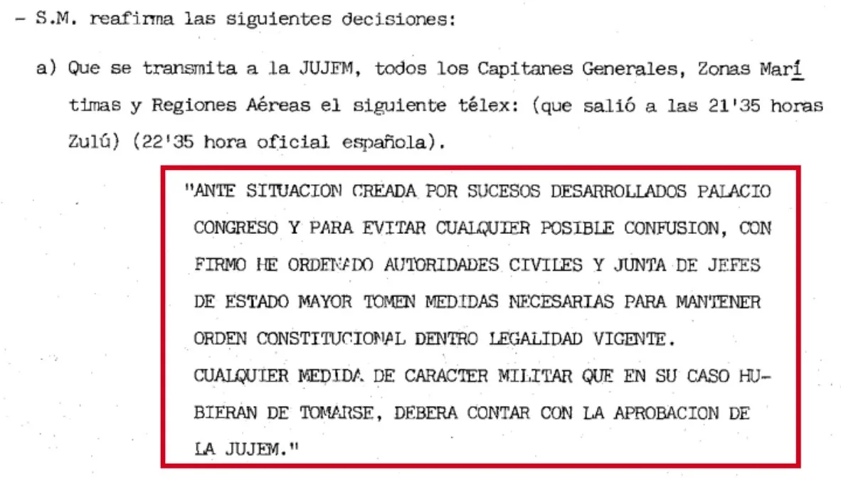 A las 22:35 se envió un télex a la Junta de Jefes de Estado Mayor (un órgano colegiado del Ejército de España), los Capitanes Generales, Zonas Marítimas y Regiones Aéreas donde se les ordena “mantener el orden constitucional”.
