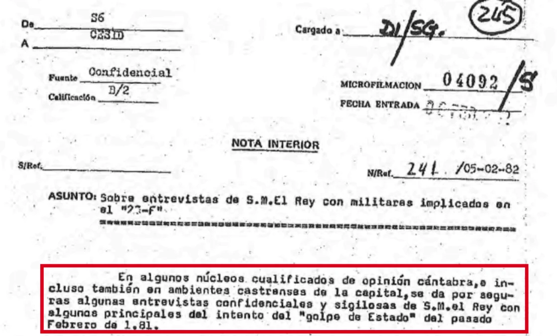 Un documento catalogado como “confidencial” y fechado el 5 de febrero de 1982, casi un año después del golpe de Estado, dice que se habría producido una reunión entre el rey y “militares implicados en el 23F” sin indicar en qué lugar habría ocurrido ni la fecha concreta. Las únicas fuentes que aporta para sustentar estas afirmaciones son “algunos núcleos cualificados de opinión” en Cantabria y “ambientes castrenses de la capital”, pero en ningún momento las identifica. Estas “entrevistas confidenciales y sigilosas” se habrían mantenido entre “alguien muy importante de la Casa Real” y los generales Armada y Milans del Bosch “del pasado febrero de 1.81 (sic)”. En el escrito se indica que Milans del Bosch exigió que el encuentro se produjese “con la propia personal real (sic), no admitiendo intermediarios ni eslabones”.