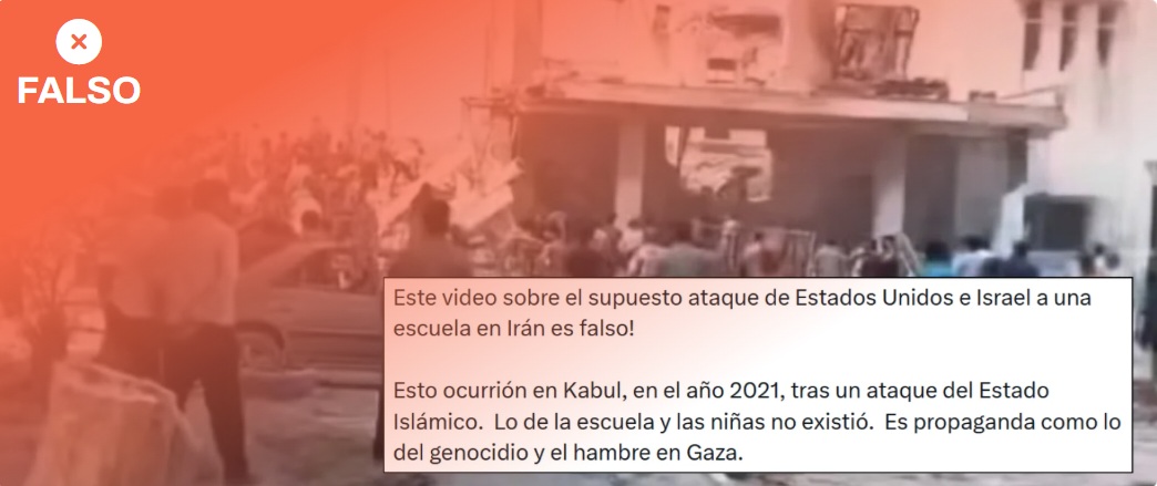 Estas imágenes de un edificio en ruinas no se registran en Kabul (Afganistán) en 2021 como sugieren algunos mensajes de redes: son actuales y se corresponden con la destrucción de una escuela situada en el sur de Irán el 28 de febrero de 2026. En Maldita.es hemos geolocalizado las imágenes en el bulevar Resalat, en la ciudad de Minab situada en la provincia de Hormozgán (27.109822431182025, 57.08470774786687), gracias a las pistas que ofrece la plataforma de inteligencia de fuentes abiertas OSINT conocida como GeoConfirmed a partir de herramientas como OpenStreetMap e imágenes satelitales. Además, los vídeos y fotografías de la destrucción de la escuela publicados por las agencias iraníes Mehr, Fars y Tasmin permiten localizar la ubicación exacta del lugar. Otras agencias como EFE y Reuters también comparten imágenes que muestran el estado del colegio tras el ataque del 28 de febrero.