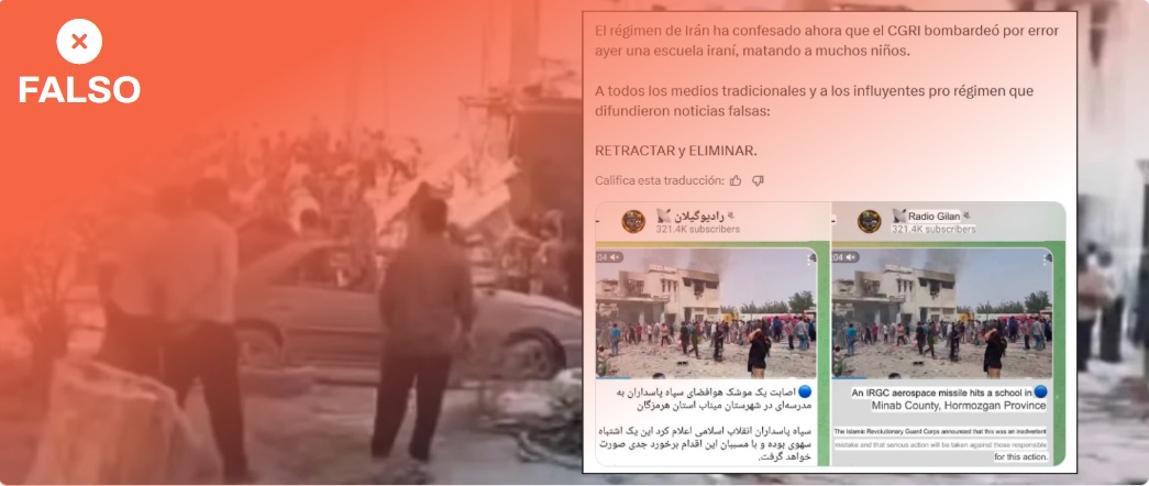 Sobre la destrucción de la escuela han circulado más contenidos, como este que afirma que Irán habría confesado que la “bombardeó por error”. El régimen de Irán no ha admitido oficialmente que la Guardia Revolucionaria Islámica bombardease por error esta escuela en Minab, en el sur del país, el 28 de febrero de 2026. A fecha de 2 de marzo de 2026 a las 15:00 horas, ninguna fuente gubernamental de Irán ha reconocido públicamente la supuesta autoría de este ataque que ha dejado al menos 148 muertos, según dijo el gobernador de la región a la agencia estatal IRNA. El ministro de Relaciones Exteriores iraní, Abbas Araghchi, dijo en su cuenta de Twitter (ahora X) que la escuela “fue bombardeada a plena luz del día” y añadió que los crímenes contra el pueblo iraní “no quedarán impunes”. De acuerdo con la cuenta GeoConfirmed, la captura de Telegram que se adjunta en algunos contenidos no corresponde a una cuenta oficial, no muestra fuente o evidencia alguna y además es un canal de esta plataforma, Radio Gilan, que califica como “abiertamente anti-régimen” mientras que el analista OSINT Tal Hagin lo asocia a “fuerzas de oposición al Gobierno iraní”.