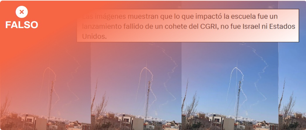 Esta imagen de rastros de humo en el cielo no guarda relación con la destrucción de una escuela primaria de niñas en el sur de Irán. Algunas publicaciones comparten la imagen como “prueba visual” para afirmar que la ocasionó “un lanzamiento fallido de un cohete” de la Guardia Revolucionaria Islámica. Pero esa imagen fue tomada en la ciudad de Zanjan, a más de 1.300 kilómetros de la escuela destruida en Minab. La plataforma de inteligencia de fuentes abiertas OSINT conocida como GeoConfirmed ha publicado en Twitter (ahora X) la ubicación exacta de esa imagen (36.685047606704615, 48.48815577991098). Según explican estos expertos, las coincidencias visuales y su geolocalización permiten constatar que “no hay forma posible” de que este misil “pudiera haber impactado la escuela”.