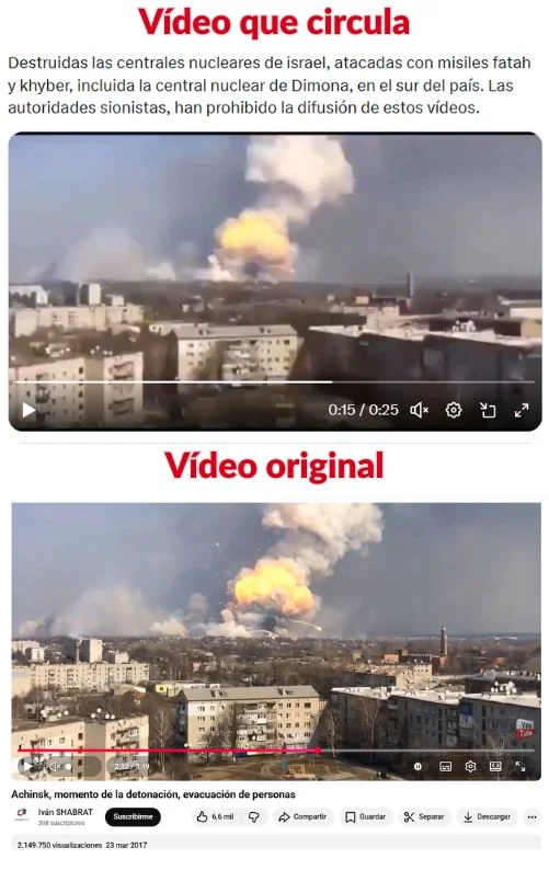 Este vídeo no corresponde con la destrucción de “centrales nucleares de Israel atacadas con misiles fatah y khyber”. El vídeo circula, al menos, desde el 23 de marzo de 2017, cuando se produjo la explosión en un depósito de municiones militares en la ciudad ucraniana de Balakliya, en Járkov. Las imágenes también las distribuyó el Ejército de Ucrania un día después de la explosión.
