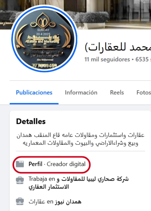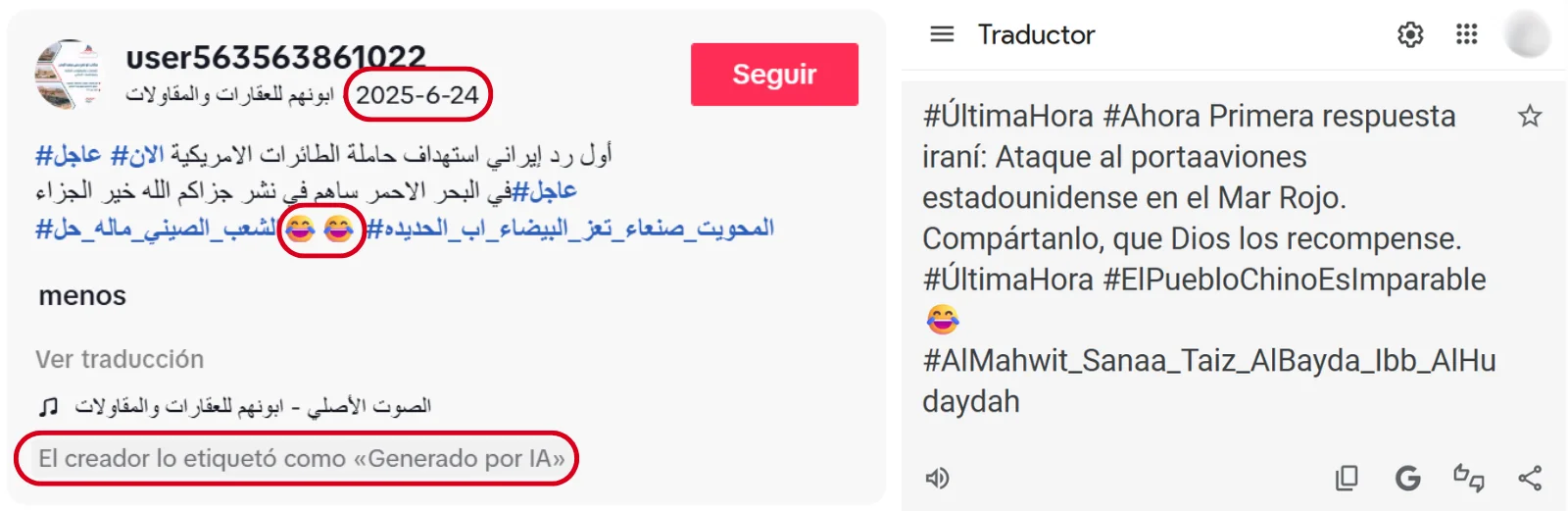 Captura de pantalla del mensaje que incluye el vídeo subido en junio de 2025 a TikTok donde se puede ver que su creador lo etiquetó como “generado por IA” y su traducción al español.Captura de pantalla del perfil de Facebook de Yahya Muhammad al-Bars donde se puede leer que se describe como un creador digital.