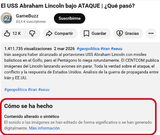 El vídeo habla de lo que se sabe a 4 de marzo de 2026 sobre el portaviones estadounidense USS Abraham Lincoln, mientras muestra imágenes en las que se ve un portaviones con destrozos. Las imágenes que usa el vídeo, que también circulan de forma aislada para asegurar que el navío estadounidense USS Abraham Lincoln fue atacado y hundido, han sido catalogadas por YouTube como “contenido alterado o sintético” por haberse creado “digitalmente”.
