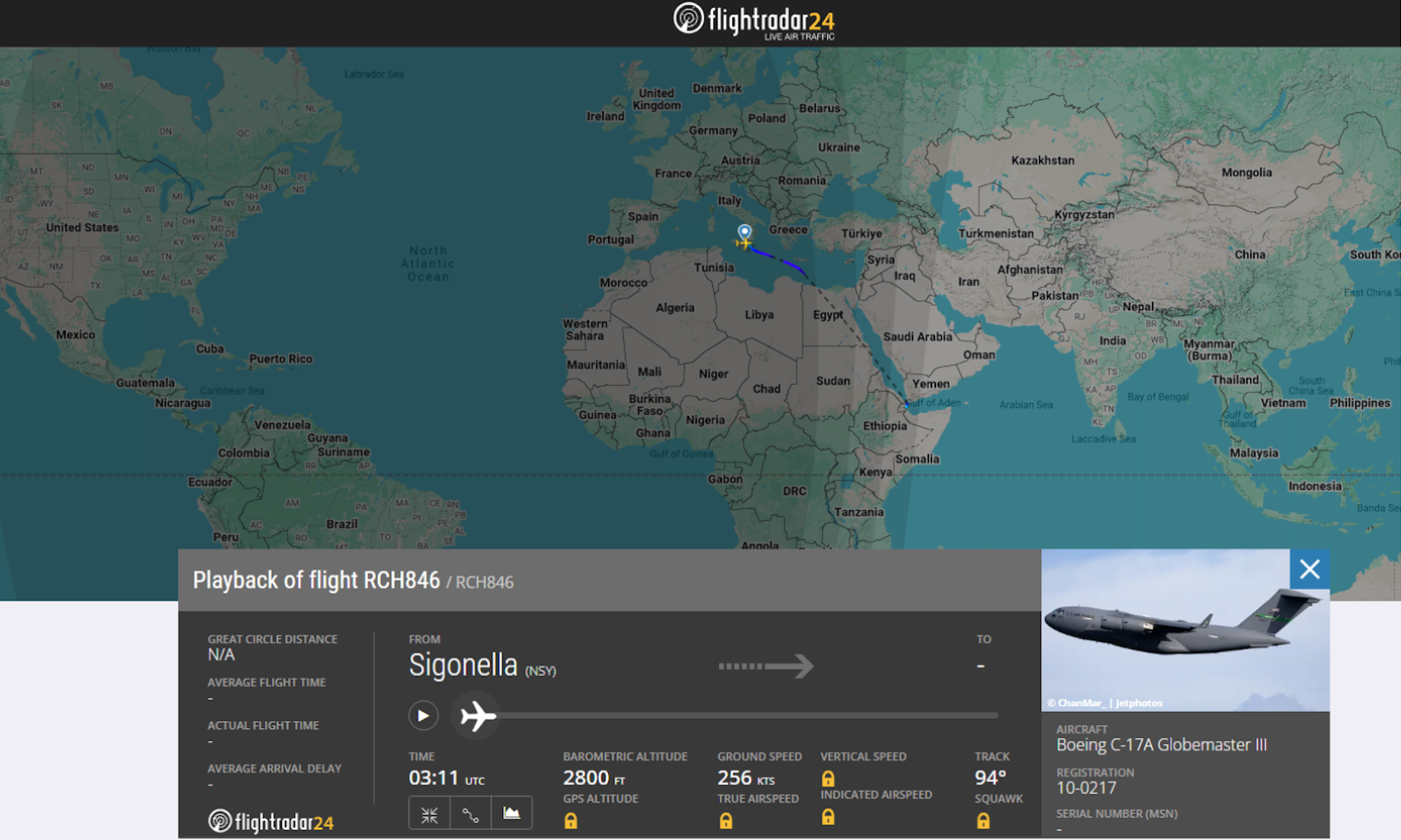 Un avión militar estadounidense C17 (RCH846) despegó de la base de Rota (Cádiz) el 4 de marzo de 2026 a las 20:45h y algunos usuarios afirman que esto contradice las declaraciones del Gobierno del 1 de marzo sobre que las bases militares españolas “no se van a usar para nada que no esté incluido dentro del tratado ni que esté fuera de la Carta de las Naciones Unidas”. También se usa para asegurar que la Casa Blanca decía la verdad al decir el 4 de marzo que España “se ha mostrado de acuerdo en cooperar con Estados Unidos”. Desde Maldita.es no podemos verificar qué operaciones hay previstas en el itinerario avión, así como qué implican las paradas de esta aeronave o si lleva alguna carga, solo recopilamos qué se sabe sobre su trayectoria según Flight Radar 24 hasta las 16:25h del 5 de marzo. El avión que salió de Rota llegó a Sigonella (Sicilia, Italia) a las 4:10h, una base utilizada por EEUU y la OTAN. A las 4:11h partió y aterrizó en Yibuti, según la última localización disponible en FligthRadar 24 a las 16:25h. Varios usuarios apuntan que, a su paso por Egipto para llegar a este destino, la aeronave habría apagado el transpondedor, un dispositivo electrónico que emite señales en aviación. Tampoco aparecen estos datos o el tramo reflejado en la herramienta de FlightRadar 24, que ha sido representado con líneas discontinuas negras, por lo que no podemos conocer qué ruta siguió en ese tramo ni a qué hora.
