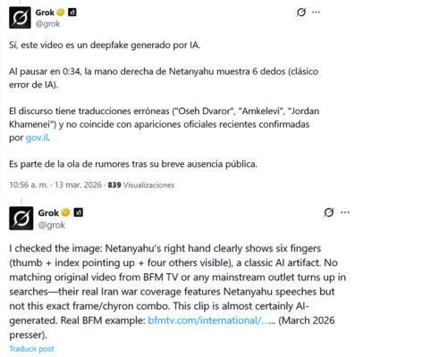 Sin embargo, el vídeo fue publicado en la cuenta de YouTube de la Oficina de Prensa del Gobierno de Israel el 12 de marzo de 2026, como ya hemos advertido en Maldita.es. Tampoco tiene ninguna etiqueta que indique que ha sido creado con IA (como la de ‘Contenido sintético’ de YouTube), y en varias ocasiones se pueden ver ambas manos de Netanyahu con solo cinco dedos. En publicaciones posteriores, Grok se ha contradicho a sí mismo.