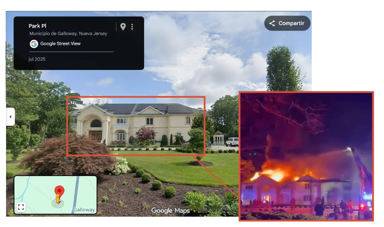 Este vídeo de una casa en llamas durante la noche no es de la residencia del primer ministro de Israel, Benjamín Netanyahu, tras el ataque de Israel y EEUU a Irán. Son imágenes de febrero de 2026 en el estado de Nueva Jersey (EEUU). A través de una búsqueda inversa del vídeo, encontramos una versión de mayor resolución publicada el 9 de febrero de 2026 en Facebook ubicando las imágenes en el barrio de Park Place, en el municipio de Garroway en Nueva Jersey. En Maldita.es hemos geolocalizado la grabación en el número 629 de Park Place (39.458082824892365, -74.46603581438008). La vista a pie de calle de Google Maps permite confirmar que se trata de la misma vivienda que aparece en el vídeo de redes sociales.