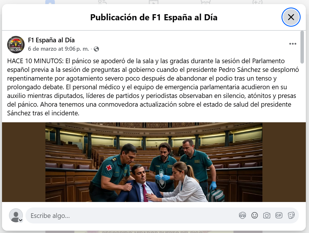 Esta imagen ha sido creada con Gemini, el chatbot de IA de Google. Así lo revela el logo de la herramienta, ubicado en la esquina inferior derecha. Además, presenta errores habituales de las imágenes creadas con IA: algunos dedos son deformes y los rostros de las personas en el fondo presentan irregularidades. Asimismo, los contenidos que lo afirman circulan sin fuentes ni pruebas e invitan a pinchar en enlaces que redirigen a artículos externos sobre Pedro Sánchez que tampoco aportan pruebas. Esas páginas web también publican otros contenidos llamativos en español, inglés e italiano sobre famosos. Los perfiles de Facebook que difunden las imagen de Pedro Sánchez también publican contenidos de fútbol, Moto GP y Fórmula 1. Además, algunas de estas páginas han publicado desinformaciones que ya hemos verificado en Maldita.es. Algunos indican que este suceso ocurrió el 5 de marzo y otros, el 6 de marzo; días en los que no hubo Pleno en el Congresoy no aparece en la agenda de Pedro Sánchez que acudiera al Congreso ninguno de los dos días. En la prensa no hay rastro de ello a 11 de marzo.