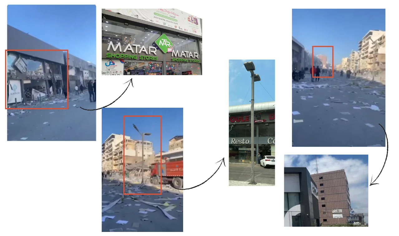 El vídeo, que circula recientemente en redes sociales, también cuenta con otros detalles que cuestionan que las imágenes estén grabadas en Israel. El texto sobreimpreso en el camión rojo [min: 00:07] está escrito en árabe y no en hebreo. A través de una búsqueda inversa, encontramos varias imágenes con el logotipo triangular que aparece en ese camión y que sugieren que se trata de la Defensa Civil Palestina de Líbano (1, 2 y 3). En Maldita.es no hemos podido verificar de manera independiente si se están produciendo bombardeos en la ciudad libanesa de Tiro.