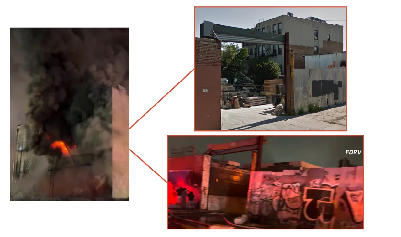 En Maldita.es hemos geolocalizado las imágenes en Flushing Avenue (40.71264731922876, -73.91822384043495), en el vecindario de Ridgewood ubicado en Queens, Nueva York. La vista a pie de calle de Google Maps permite constatar que se trata del mismo edificio que aparece en el vídeo de redes sociales.