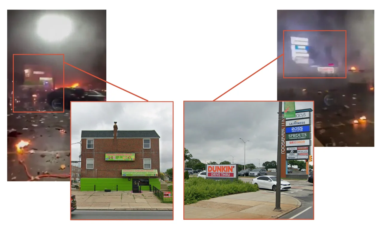 En Maldita.es hemos geolocalizado las imágenes en la Avenida Cottman (40.04597196432349, -75.05684848219154), como permite constatar el exterior de la cafetería Dunkin’ desde donde se graba el vídeo y el edificio de ladrillos rojo que aparece enfrente.