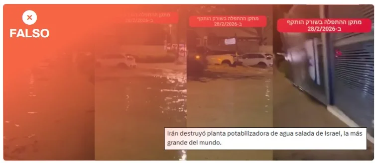Este vídeo de varios vehículos atrapados en una calle inundada durante la noche no muestra un ataque reciente de Irán a una desalinizadora en Israel. Las imágenes se corresponden con las inundaciones que tuvieron lugar en diciembre de 2025 en Israel tras el paso de la tormenta Byron, a pesar de que en redes circulan con un cartel con la fecha, como si fueran imágenes del 28 de febrero de 2026.