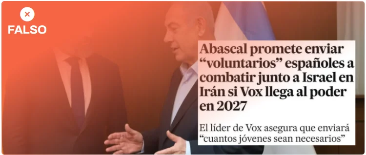 Esta captura de una publicación que dice que Abascal "promete enviar 'voluntarios' españoles a combatir con Israel" si gana en 2027 es falsa: imita a El País y no hay rastro de esas declaraciones