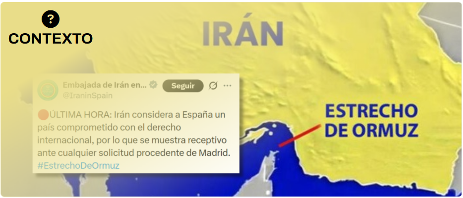 Al Ministerio de Exteriores, a preguntas de Maldita.es, no le “consta información”, a 27 de marzo, sobre que “Irán deje pasar a los petroleros españoles por el Estrecho de Ormuz”, como circula. Maldita.es le ha vuelto a preguntar el 7 de abril, sin respuesta a la hora de actualizar el artículo. Por su parte, la Embajada de Irán en España afirmó en Twitter (ahora X) el 26 de marzo de 2026 que “Irán considera a España un país comprometido con el derecho internacional, por lo que se muestra receptivo ante cualquier solicitud procedente de Madrid”, con una imagen del Estrecho de Ormuz y el hashtag #EstrechoDeOrmuz. En un comunicado de la representación iraní ante la ONU, declararon que “los buques no hostiles podrán —siempre que no participen ni apoyen actos de agresión contra Irán y cumplan plenamente con las normas de seguridad declaradas— beneficiarse del paso seguro por el Estrecho de Ormuz en coordinación con las autoridades iraníes competentes”. En el escrito no mencionaban a ningún país “no hostil”.