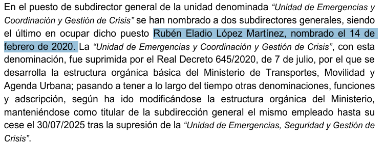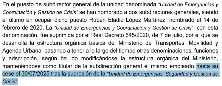 El Ministerio de Transportes modificó su estructura en julio de 2025 y “suprimió”, en palabras textuales del BOE, la Unidad de Emergencias, Seguridad y Gestión de Crisis. Este organismo se sustituyó por un observatorio, del que no hay información pública sobre sus reuniones, funciones o composición a fecha de publicación de este artículo.