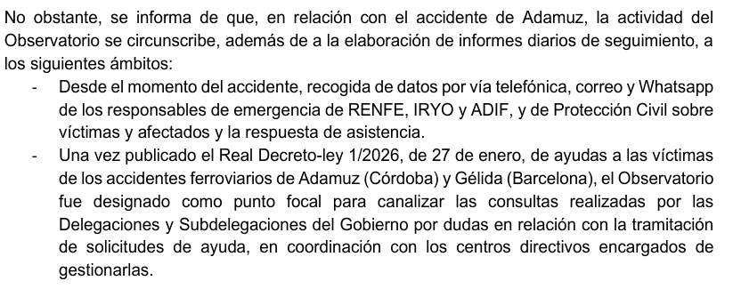 No se conocen las funciones del Observatorio en el accidente de Adamuz porque no existe información pública al respecto. Según ha indicado el Ministerio de Transportes a Maldita.es a través de transparencia, el observatorio se encargó de la “recogida de datos por vía telefónica (...) sobre víctimas y afectados y la respuesta de asistencia” y ejerció como “punto focal para canalizar las consultas (...) en relación con la tramitación de solicitudes de ayuda”, sin facilitar la documentación sobre los informes diarios de seguimiento del accidente que le requerimos.