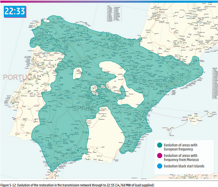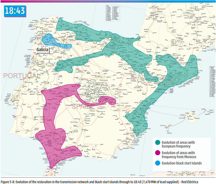 En el informe final europeo se puede comprobar cómo el sistema fue recuperando tensión desde las redes eléctricas de Francia y Marruecos y con algunas centrales que tienen capacidad para arrancar de forma autónoma, un mecanismo conocido como arranque en negro o black start en inglés.