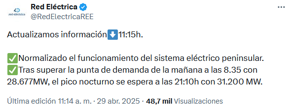 Fuente: https://x.com/RedElectricaREE/status/1917145514279158246 Qué dijo el Gobierno español las horas siguientes al apagón