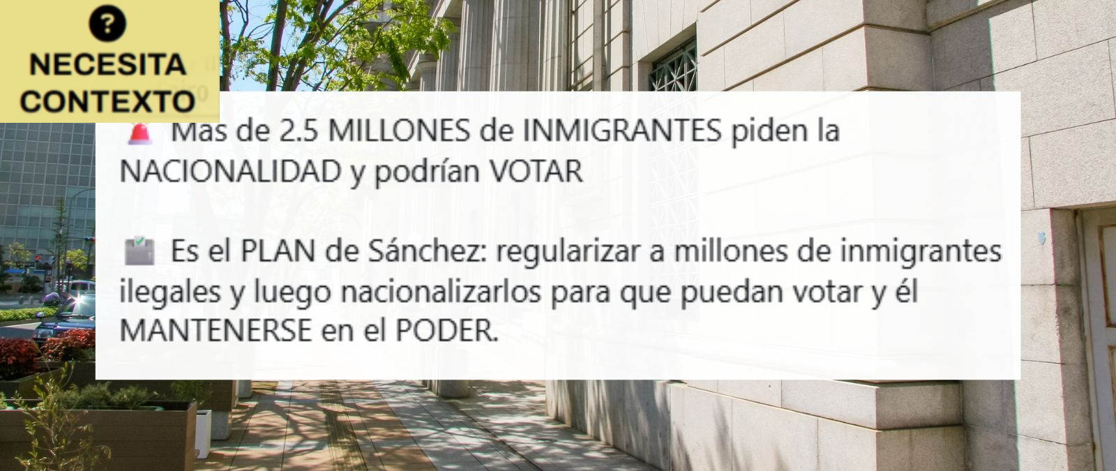 La regularización extraordinaria de personas inmigrantes no supone la concesión de la nacionalidad “sin un certificado de antecedentes penales”, como afirman los contenidos difundidos. La nacionalización y la regularización son procesos diferentes, aunque para la nacionalidad, primero es necesario estar en situación regular. En ambos procedimientos, se exige acreditar no tener antecedentes penales, aunque en el caso de la regularización extraordinaria, en un primer momento se planteó la posibilidad de sustituir el certificado de inexistencia de antecedentes por una declaración responsable. Los contenidos que se difunden utilizan un titular de una publicación de The Objective que ya ha sido rectificada, aclarando en sus redes sociales que se referían a la medida anunciada por el Gobierno de conceder permisos de residencia a personas migrantes en situación irregular.