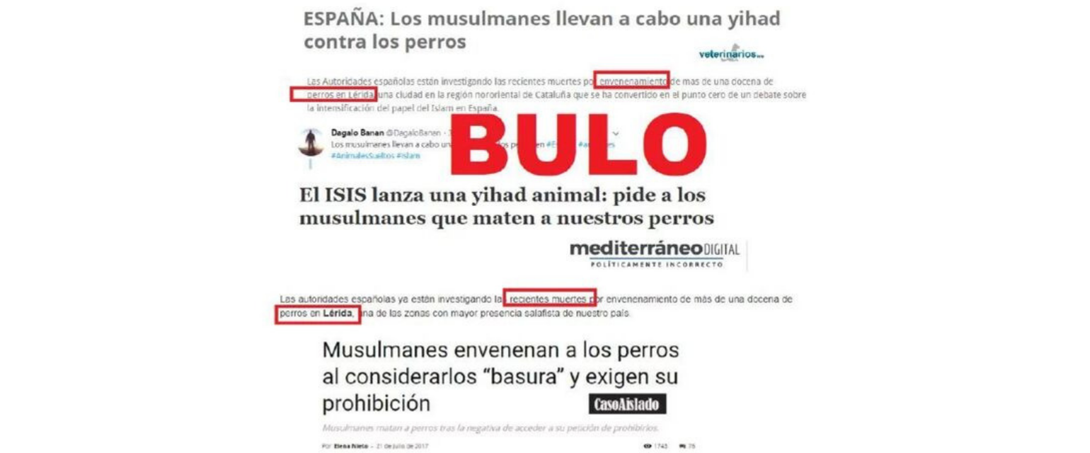 ¿Una "Yihad"? ¿En Lleida? La realidad es que el enlace que adjunta es de 2011, concretamente de un blog que afirmaba que los "musulmanes están llevando a cabo una yihad contra los perros". En él se dice que las "autoridades españolas están investigando las recientes muertes por envenenamiento de más de una docena de perros en Lérida" y asegura que los vecinos de la zona señalan, una vez más, a los "inmigrantes musulmanes" como los responsables de haber matado a los perros. Además, el post lleva las etiquetas de "España", "Invasores" e "Islam".