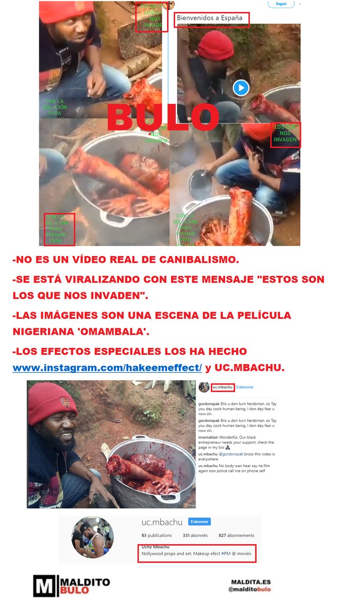 No. El vídeo de "canibalismo" con el mensaje: "estos son los que nos invaden" no es real. Es una escena de la película nigeriana 'Omambala'. Son efectos especiales.