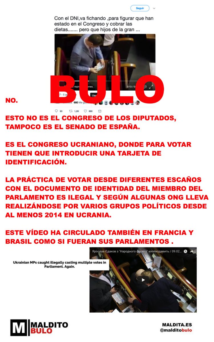 Circula un vídeo donde un diputado introduce las tarjetas de identificación de otro para fichar. No es España. El parlamento que sale en las imágenes no es ni el Congreso ni el Senado. Es el Parlamento ucraniano. Aquí no se necesita tarjeta de identificación para votar. El vídeo no hay pruebas de que esté manipulado pero no tiene relación con España.