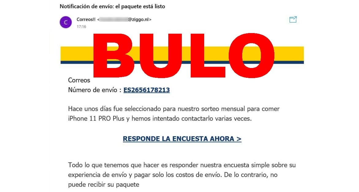 El correo llega desde una dirección terminada en '@ziggo.nl', la cual no es una dirección oficial de Correos. Además, hay otros detalles que hacen sospechar de que no es un sorteo real de Correos, como las faltas de ortografías y las frases sin sentido.