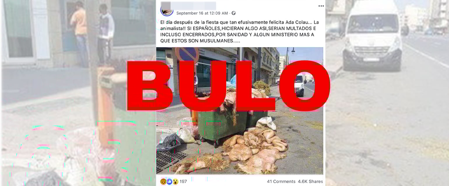 Nos habéis preguntado sobre una fotografía en la que se ven pieles de animales tiradas en un contenedor y sobre si está tomada tras una fiesta musulmana en España, como insinúa el texto "El día después de la fiesta que tan efusivamente felicita Ada Colau... La animalista!! Si españoles, hicieran algo así, serian multados e incluso encerrados, por sanidad y algún ministerio más a que estos son musulmanes..." que se está viralizando. Os contamos que es un bulo que también ha saltado a Francia: está tomada en Marruecos y lleva difundiéndose al menos desde 2016.