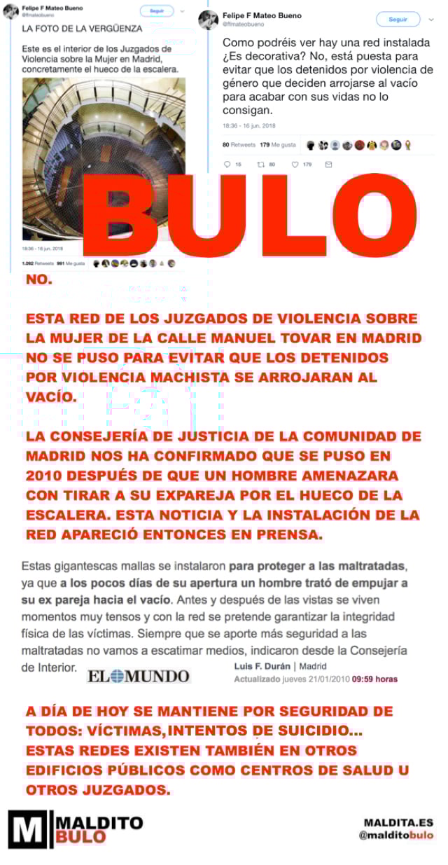 No, esta red de los juzgados de violencia sobre la mujer en c/ Manuel Tovar (Madrid) no se puso para evitar que los detenidos por violencia machista se arrojaran al vacío. La Consejeria de Justicia confirma que se puso en 2010 después de que un hombre intentara tirar a su expareja. A día de hoy se mantiene por la seguridad de todos: víctimas, intentos de suicidios, trabajadores...