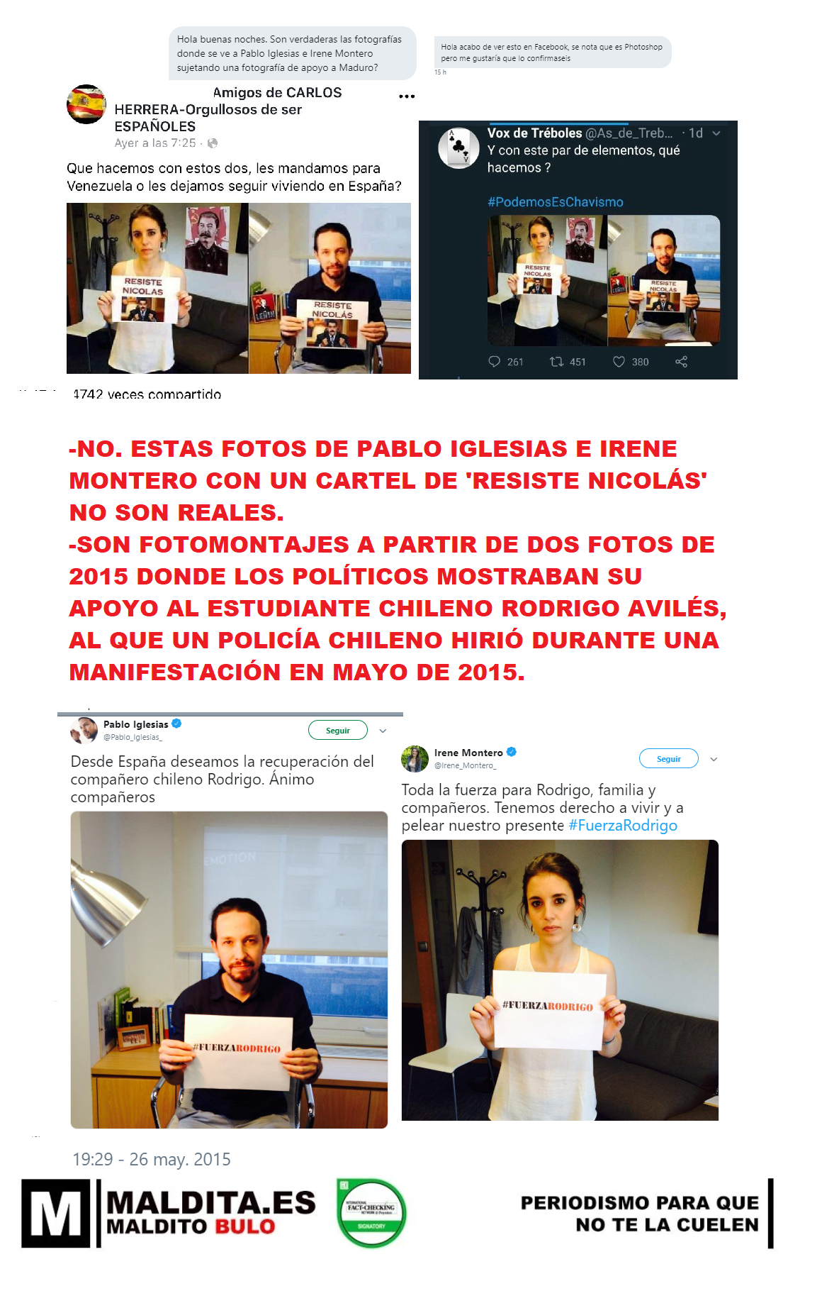 Son fotomontajes a partir de dos fotos de 2015 donde los políticos mostraban su apoyo al estudiante chileno Rodrigo Avilés, al que un policía chileno hirió durante una manifestación en mayo de 2015.