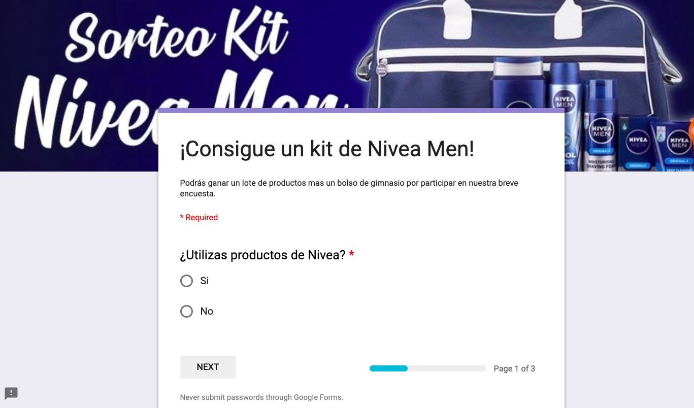 Todo empieza con un formulario de Google titulado "¡Consigue un kit de Nivea Men!" en el que te piden que respondas a unas preguntas relacionadas con la empresa a cambio de optar al regalo.