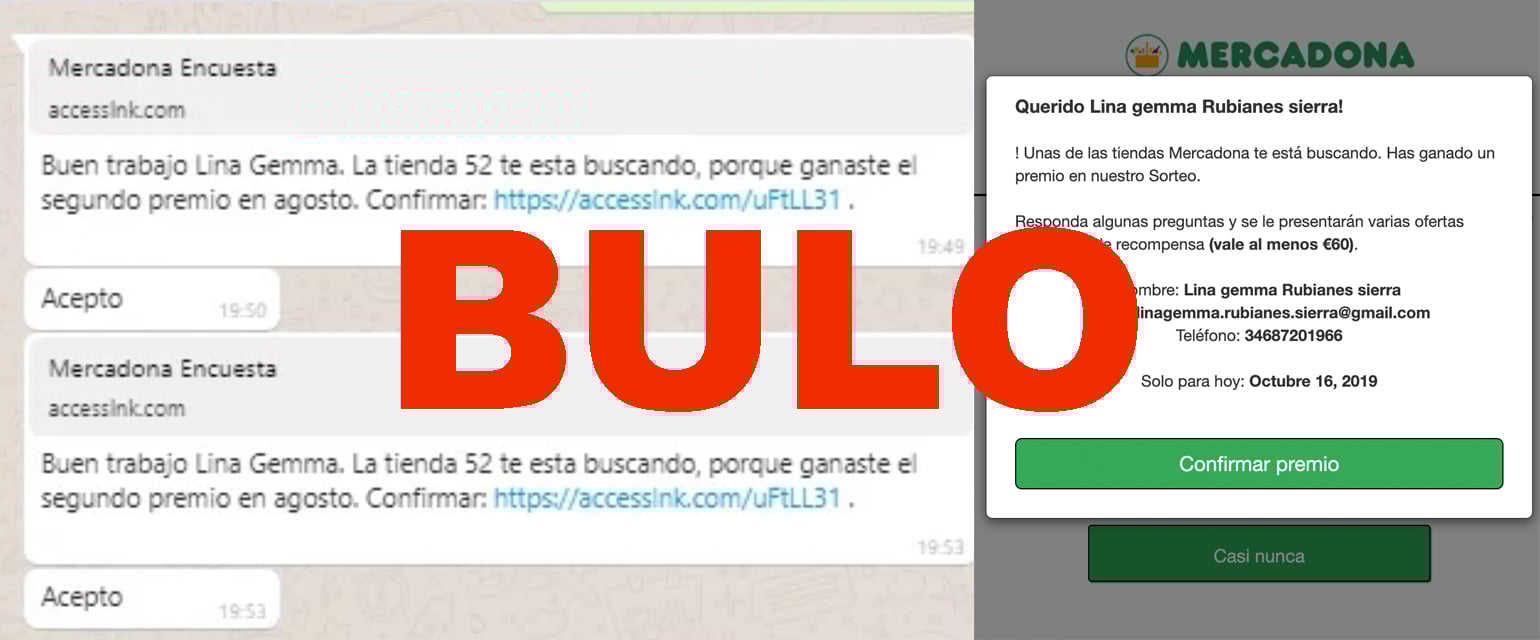 Nos habéis escrito a través de nuestro servicio de WhatsApp (655 19 85 38) para preguntarnos si este supuesto sorteo de una "oferta exclusiva de recompensa" de Mercadona es cierto. Es un bulo: Mercadona nos confirma que este supuesto sorteo no es suyo y nos aseguran que desde la empresa no organizan ningún tipo de sorteo.