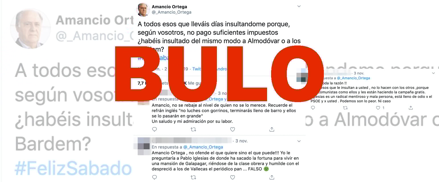 Nos habéis preguntado mucho a través de WhatsApp si es real este tuit supuestamente de Amancio Ortega en el que dice "a todos esos que lleváis días insultándome porque, según vosotros, no pago suficientes impuestos ¿habéis insultado del mismo modo a Almodóvar o a los Bardem?". No lo es, es un bulo. Se trata de un tuit de una cuenta de Twitter que se autodenomina parodia y que utiliza el nombre del dueño de Inditex.