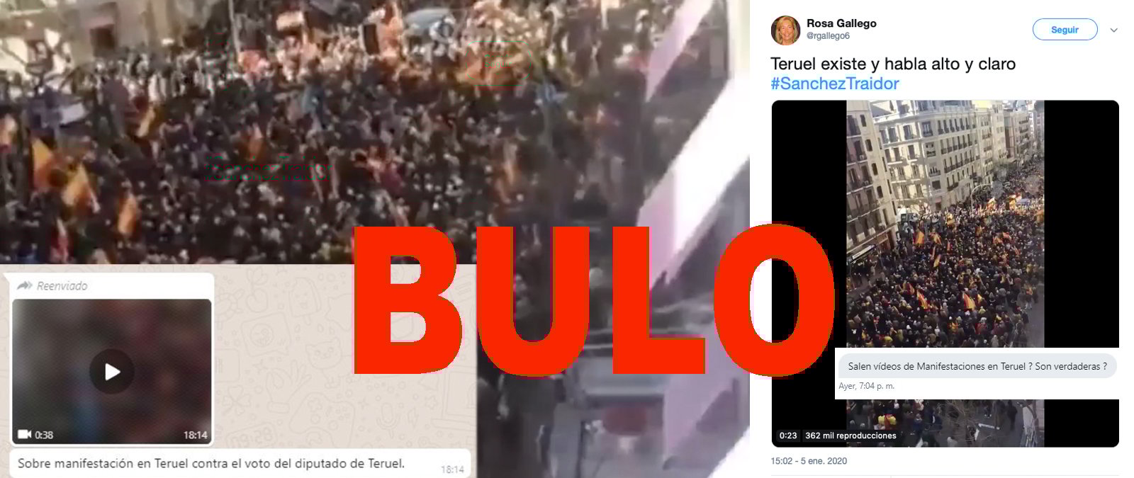 Nos estáis preguntando por un vídeo en el que se ve una manifestación con gente llevando banderas de España. Se difunde afirmando que es "todo Teruel en la calle" o que la manifestación ha tenido lugar en Teruel para pedirle a Tomás Guitarte, líder de Teruel Existe, que no apoye la investidura de Pedro Sánchez. Es un bulo: es un vídeo de una manifestación en Madrid, no en Teruel, y coincide con una manifestación que tuvo lugar en Madrid el pasado 4 de enero en protesta contra la investidura.