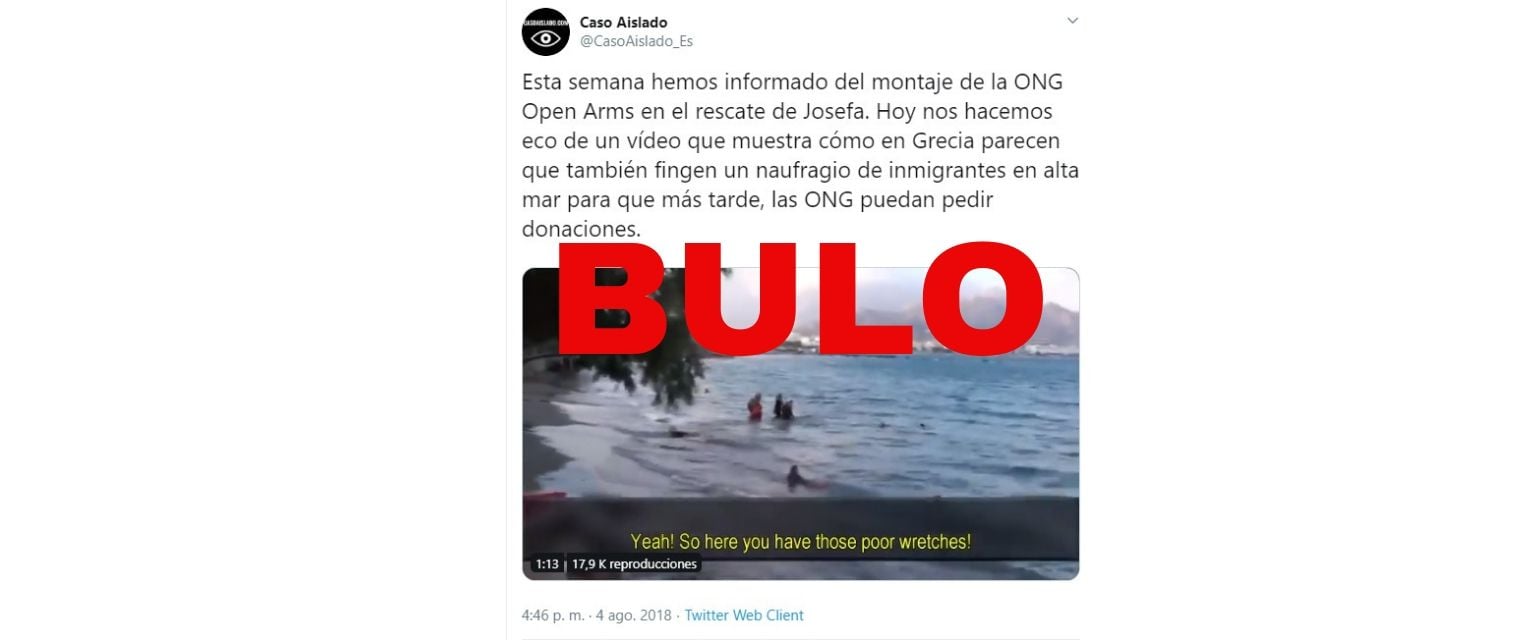 Nos habéis hecho llegar estas imágenes en las que varias mujeres con velo se meten en el mar junto a otras personas flotando cerca mientras que desde la orilla un equipo de rodaje les envían directrices. Sobre estas imágenes diferentes usuarios y la web Caso Aislado han asegurado que este vídeo "muestra cómo en Grecia parecen [sic] que también fingen un naufragio de inmigrantes en alta mar para que más tarde, las ONG puedan pedir donaciones". Esto es un bulo.