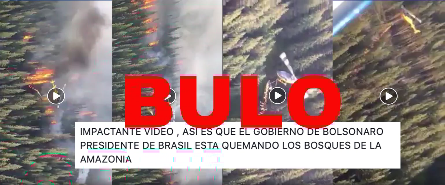 En los últimos días, con los incendios de la Amazonia, nos habéis hecho llegar muchas consultas sobre este tema. Algunas de ellas ya os hemos contado que son bulos. Ahora os contamos que el vídeo en el que se ve un helicóptero con un dispositivo que parece expulsar llamas sobre un incendio forestal ni está grabado en los incendios de la Amazonia brasileña de 2019 ni está relacionado con el Gobierno de Bolsonaro.