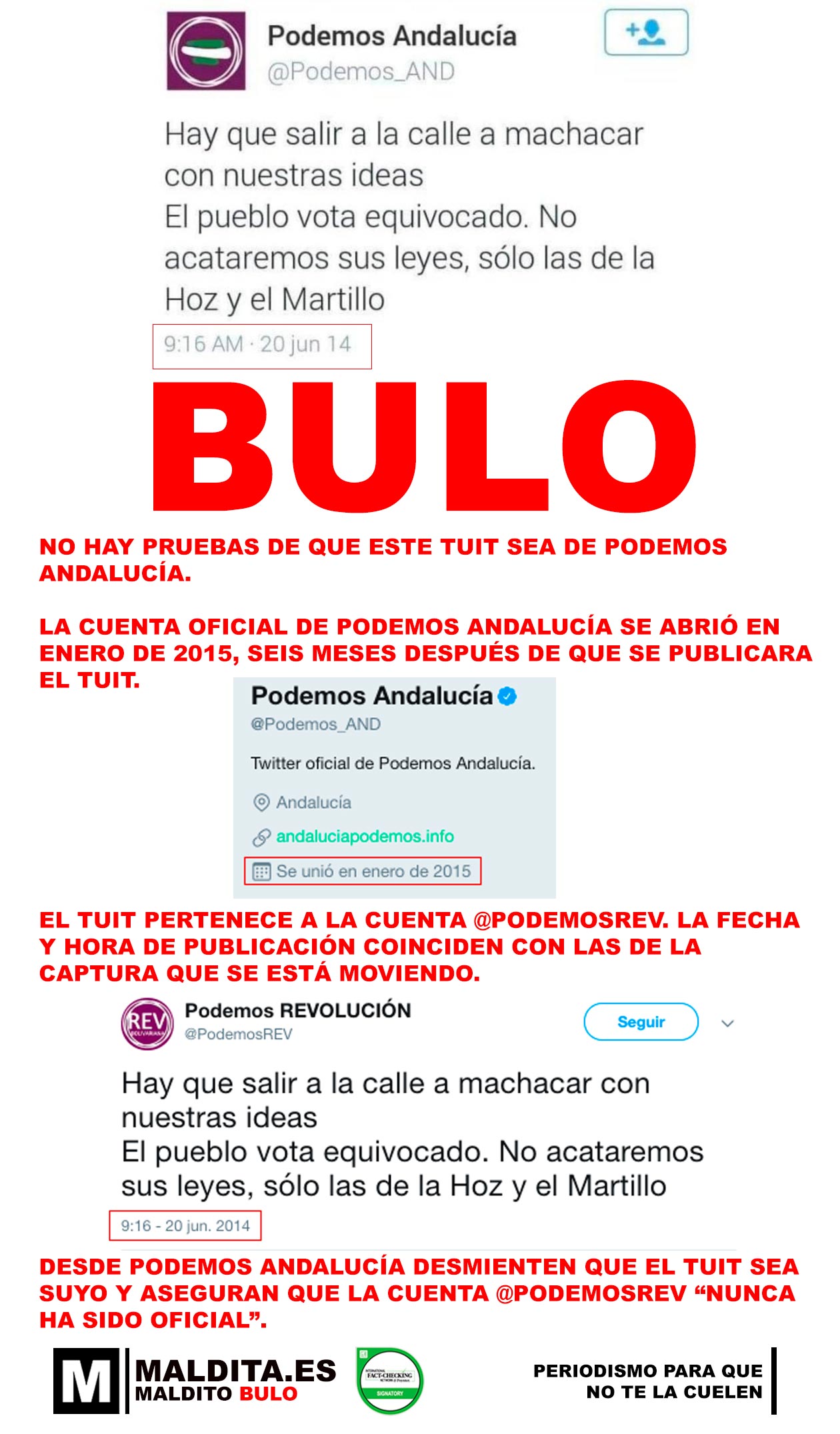 «[T] No hay pruebas de que este tuit que habla sobre no acatar leyes o machacar con ideas sea de Podemos Andalucía»