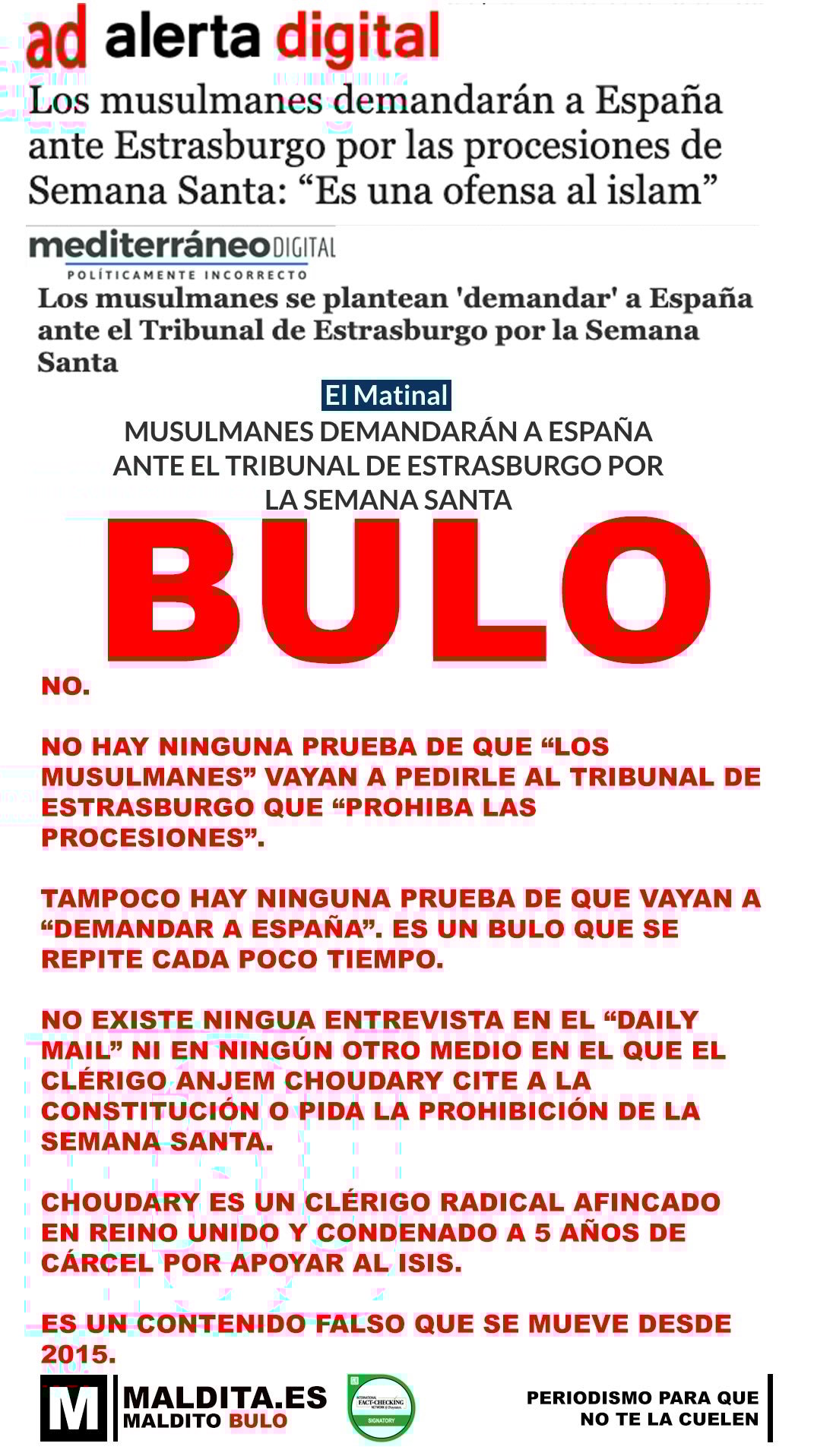 No, no hay ninguna prueba de que "los musulmanes" vayan a pedirle al Tribunal de Estrasburgo que "prohiba las procesiones". Tampoco ninguna prueba de que vayan a "demandar a España". Es un bulo que se repite cada poco tiempo.