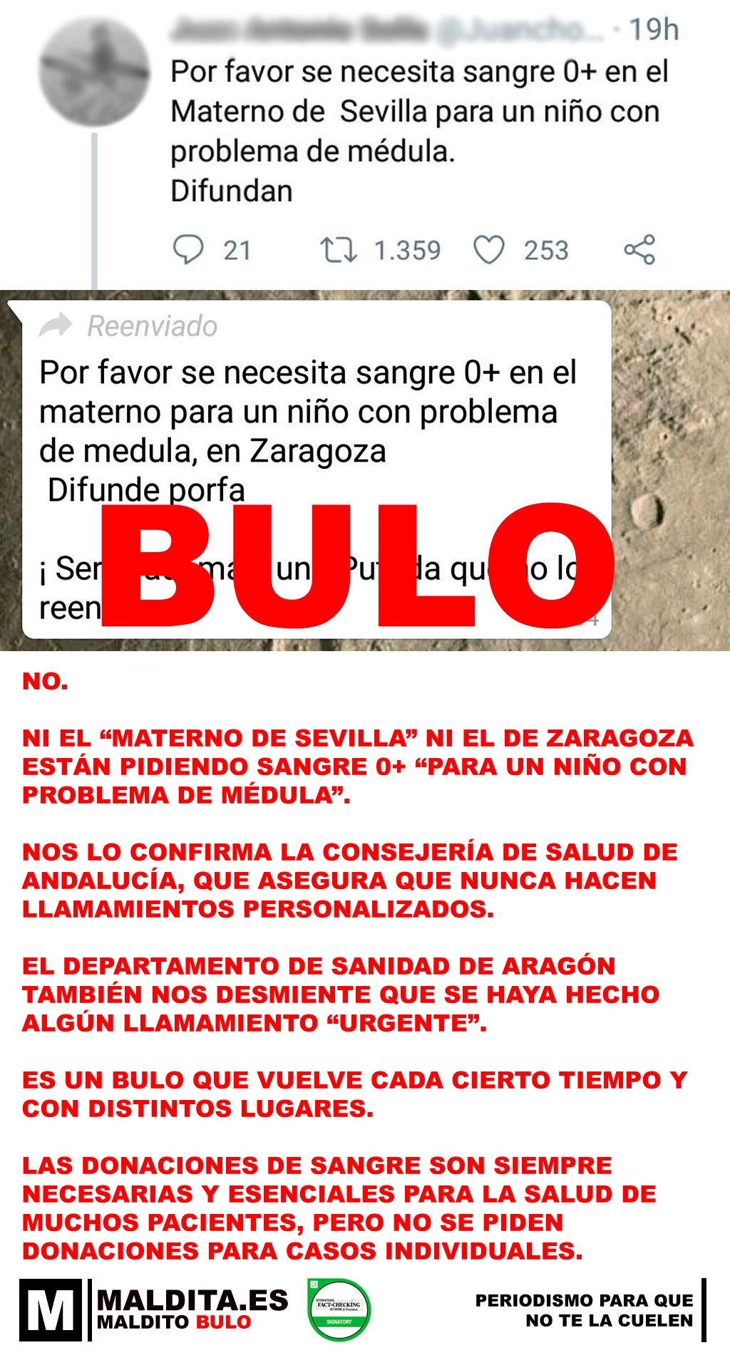 «[T] No, ni el "materno de Sevilla" ni el de Zaragoza están pidiendo sangre 0+ "para un niño con problema de médula"»
