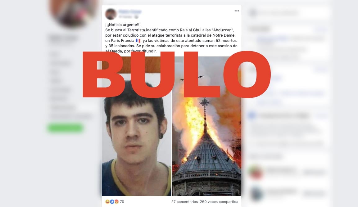 En dicha publicación aseguran que la persona responsable del suceso había sido identificada como Ra's al Ghul, alias Abduzcan, y se inventan que el fuego provocó 52 muertes y 35 lesionados. Como decimos, ni el hombre de la foto es el "terrorista" de Notre Dame, ni se han producido esas víctimas mortales o heridos.